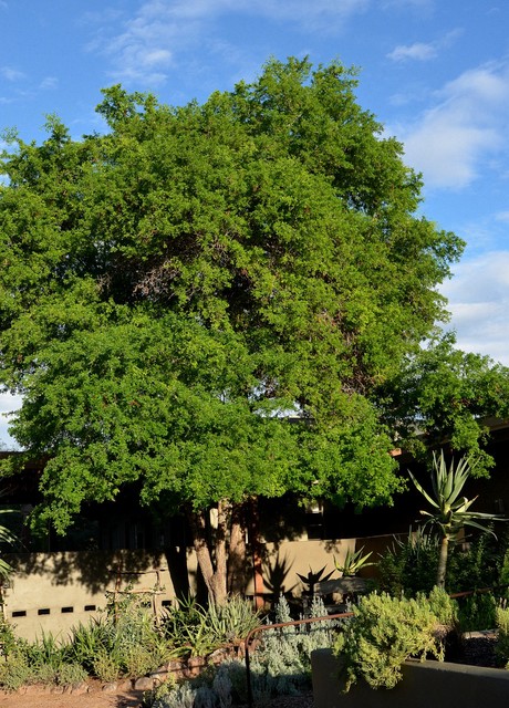 Flowers generally occur at the ends of branches. It can be grown in a cluster or as a patio tree. Its dense dark-green foliage contrasts well with foliage from desert plants.